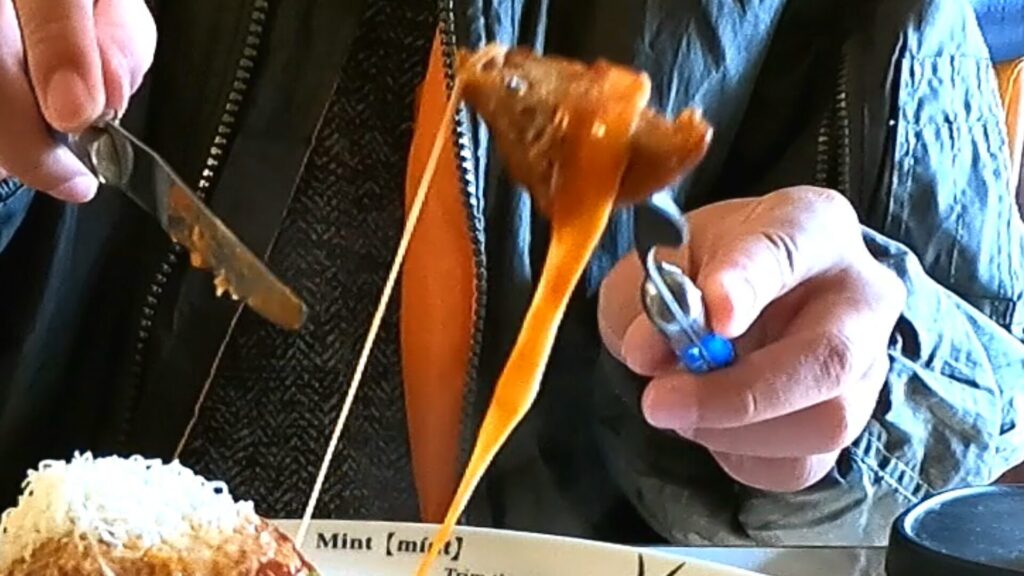 とろ〜りと伸びて、2種類の肉の個性をマイルドにまとめつつ、コクをプラス