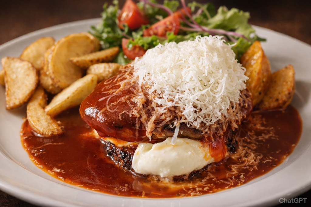 チーズのまろやかさが肉のワイルドさを包み込んで、相反する味わいが絶妙に調和しています