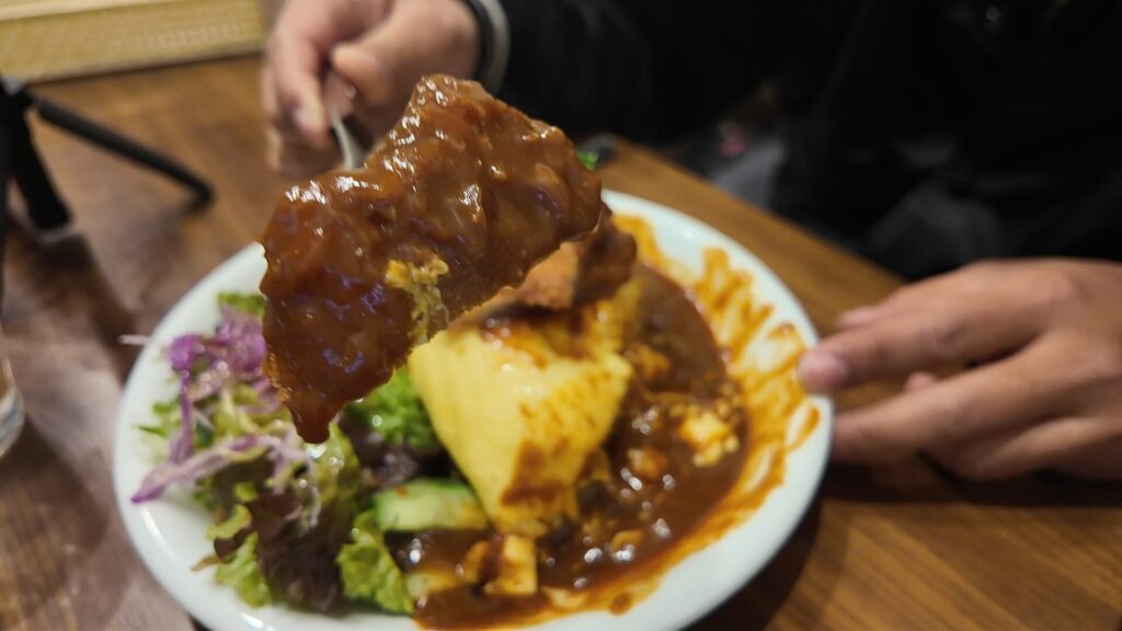 卵のまろやかさ、チキンライスの優しい甘さ、カツのジューシーさ デミグラスのコクが全部合わさって