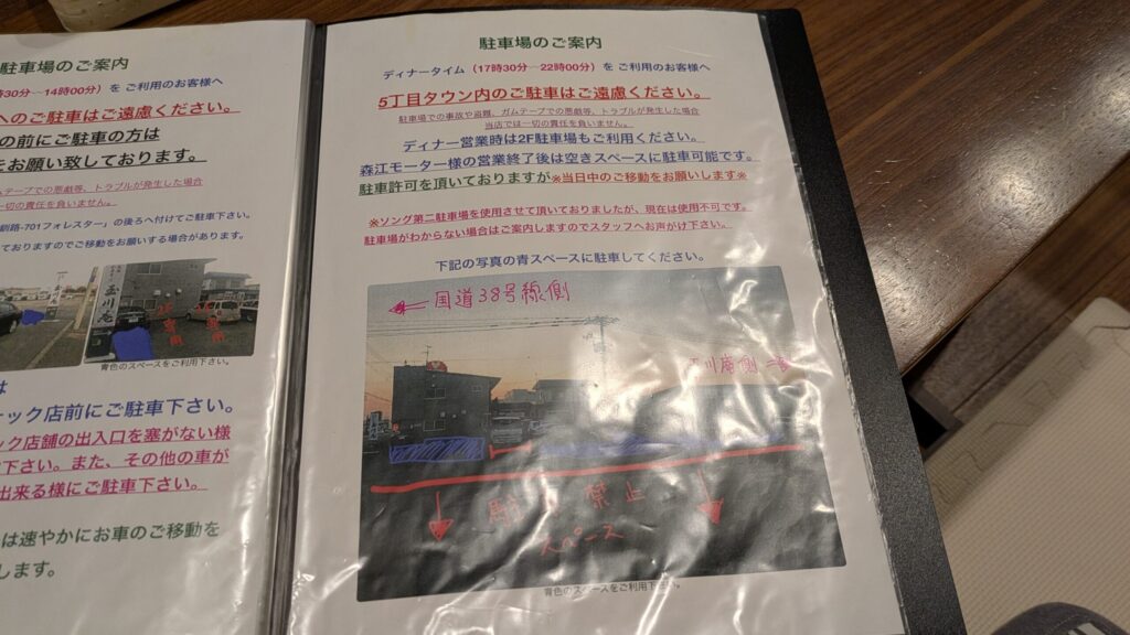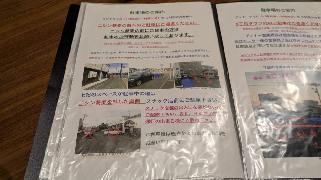 - 駐車場の停め方が昼夜で違うので注意