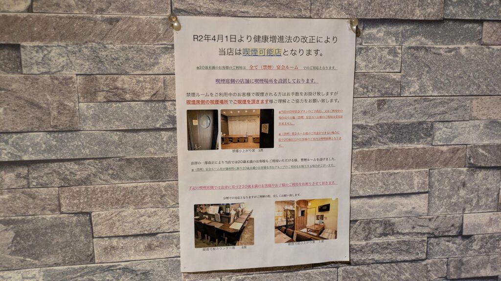 カウンター側の席と小上がりは喫煙可能席となっています